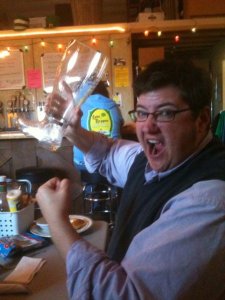 We drank and drank and scarfed down a pizza that at that moment, seemed like the best pizza in the world. It could have been rancid and freezer-frosted, but in actuality, I think it was rather tasty. Finally, we were getting near to the end of the boot. I looked at what was left in it, something close to a full pint, and took a breath. Jody, the veteran boot drinker of our bunch, was next after me, and I didn’t want her to show me up. I looked around the room and noticed that everyone was noticing me. All of the people at the table but me had doctorates, but I was the big man, and suddenly I felt like I was being measured in terms of masculinity. I didn’t want to weigh in on the Pee Wee Herman end of the scale, I wanted Lou Ferigno. And I hated that I didn’t want to be teased for not finishing this thing, so I tilted the boot back and finished it. Woo hoo! We cheered. Jody snapped a picture. And from the other table, an older man and his wife clapped, but then he totally deflated my ego by saying, almost under his breath but just loud enough for me to discern: