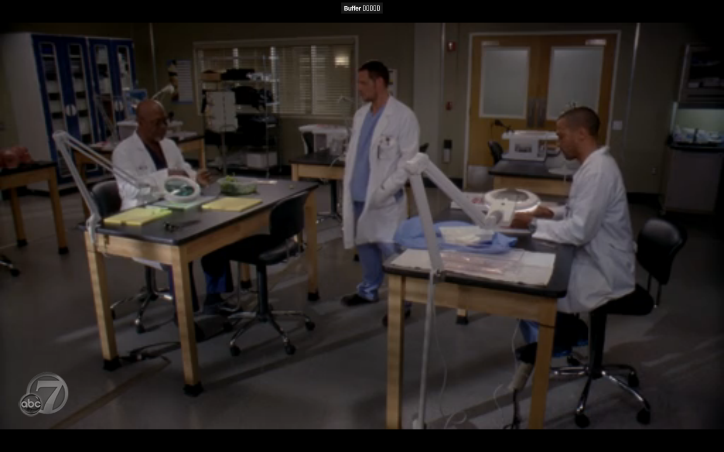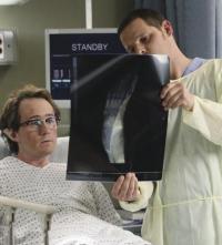 In the Kepner, Avery, Karev household, women’s tiny underwear float around like butterflies. Kepner has had it, and tosses a just-laundered pair of panties at her male housemates. Keep this in your own space, she asks, presuming it’s one of Karev’s weekly trysts at fault. Avery pipes up, hang on, that’s Lexie’s. Neither Kepner nor I believe him, but he insists, until she leaves, and then Alex takes back the underwear, saying it’s Lauren’s, from radiology. I’ve been trying to come up with a joke about thongs and x-rays, but I got nothing. Sorry, folks.