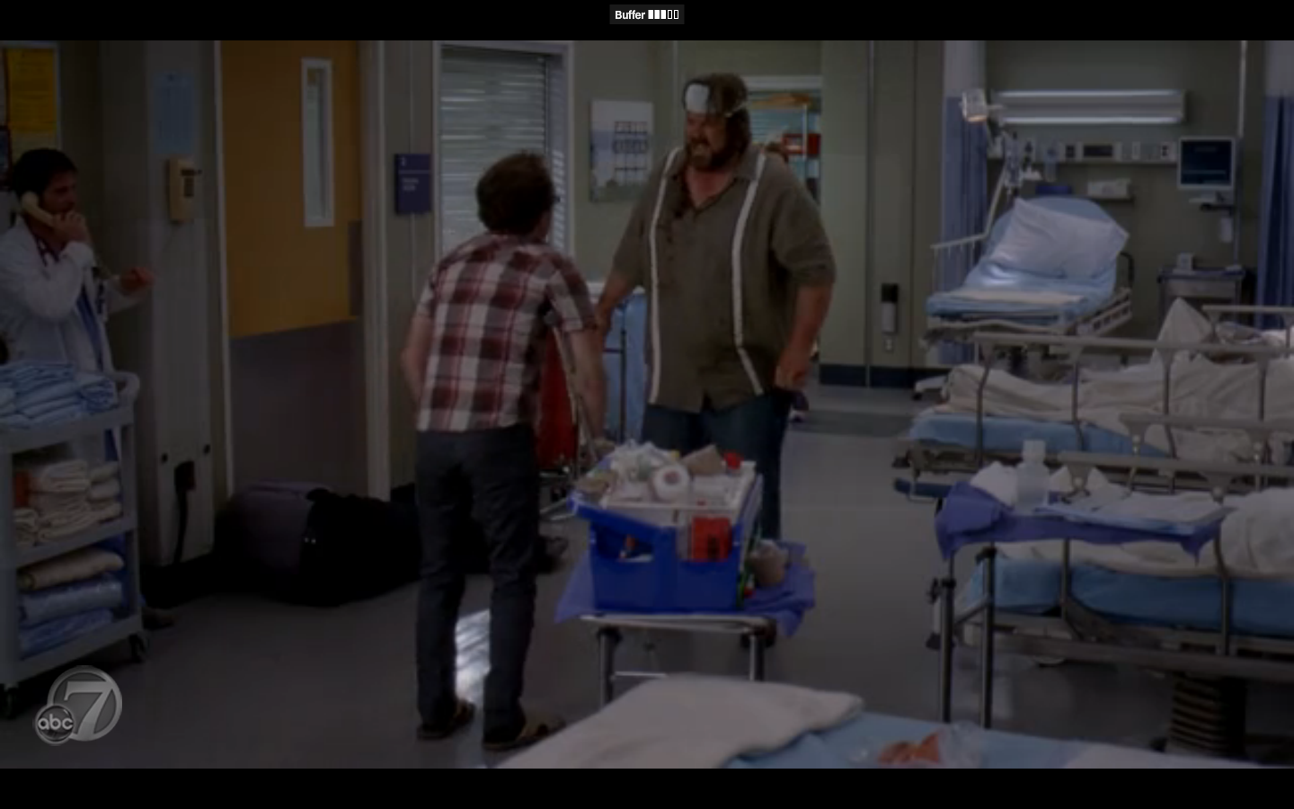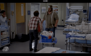 Little hobbit guy is disappointed that his injuries aren’t worse than some broken toes. Be careful what you wish for, dude! Wishes seem to be coming true this week. Sure enough, he feels the need to hobble (a hobbling hobbit, wow) in the next day, basically to see Kepner again. Go away, Alex tells him. What if I have chest pains, he asks. Then you have to observe me. Fair enough, says Karev, attaching him to an EKG. This is not Kepner’s version of Denny, come on now. But his sweetness comes up a notch when a violent patient, the bottle-thrower, loses it on the staff. Cue the two-dimensional character! Nobody knows what he’s angry about, but the giant of a man seems to have a lot of it. Enter hobbit, stage right, perched on his crutches, looking up at the big bully. One should always walk into a fight mumbling, “We are a gentle folk who crave adventure.” In no time at all The Antagonist grabs a crutch and begins to beat the hobbit in his midsection. Three people can’t contain this guy, but Chief Hunt comes in and nails him right in the kisser, saving the day.