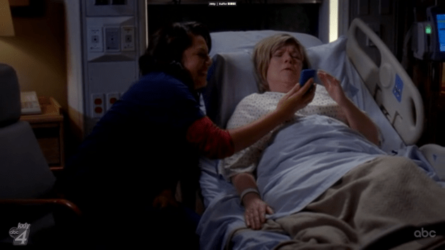 Callie checks in with Meredith on the seriousness of Louise’s condition, and Grey adds that George’s mom noticed the ring, and clearly misses Callie. It wouldn’t be a bad thing to be there when she wakes up, says Grey. And this will lead us to one of the sweetest moments on television this year.