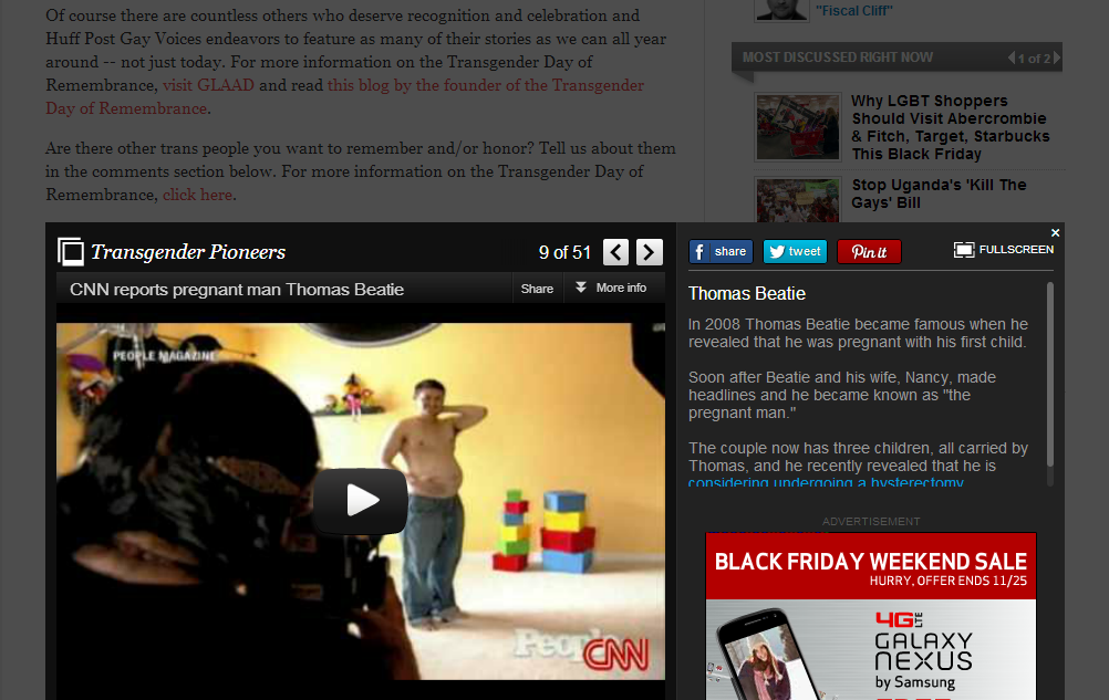 The Transgender Day of Remembrance came around last week, and to commemorate the day several web sites ran articles about transgender people, but not necessarily with regard to the individuals who died due to violence or suicide. The Huffington Post, for one, ran a list of photos of “transgender pioneers” which for many people in the trans community, myself included, seemed an odd way to memorialize murdered people. Was the intent to offer our most stellar examples of humanity for the nontrans masses so that they could learn more about us? To contextualize the extremely stark statistics about hate crimes? Or did the list of 50 “pioneers” distract from a more helpful conversation about marginalization and the media’s avoidance of these stories and lives?